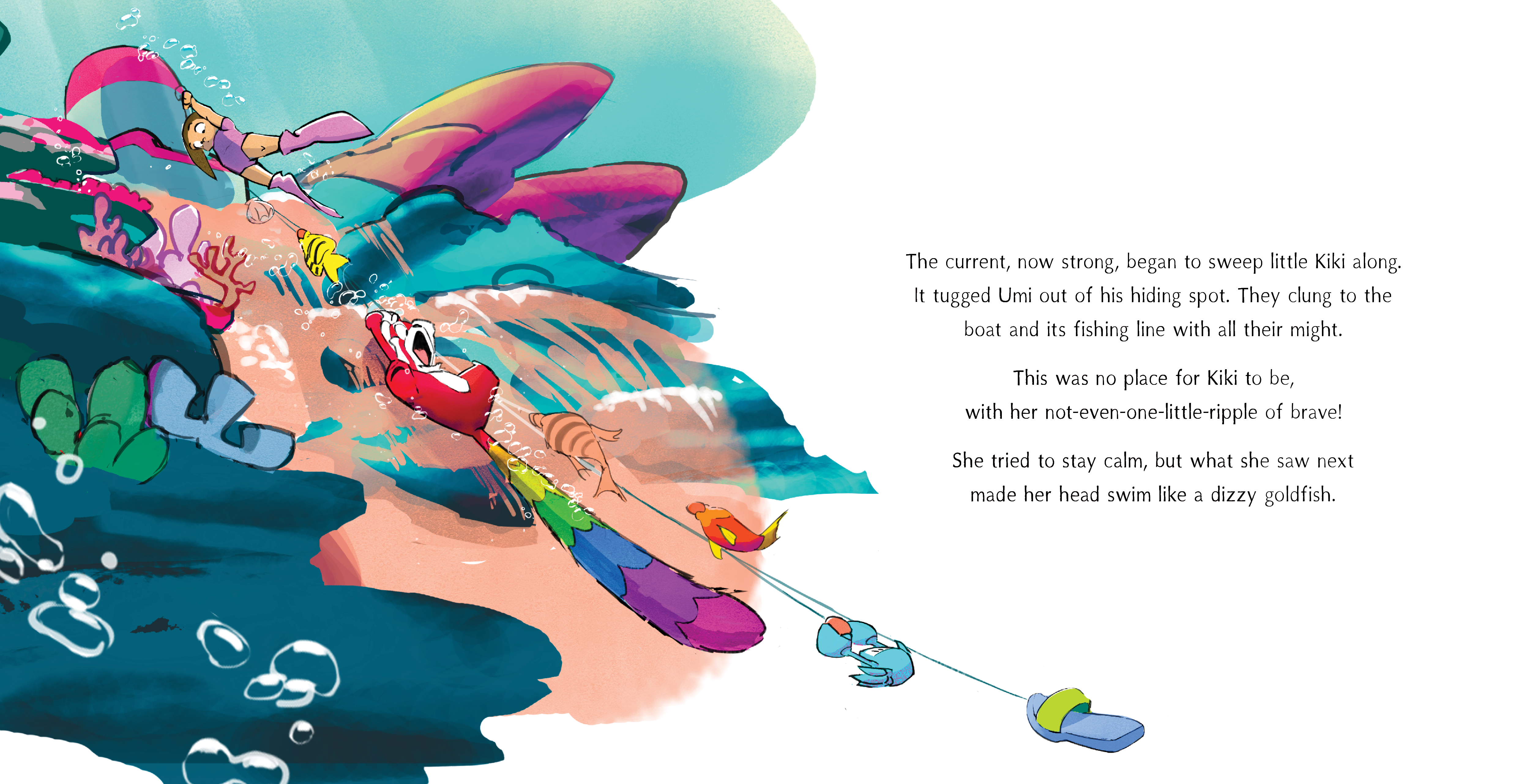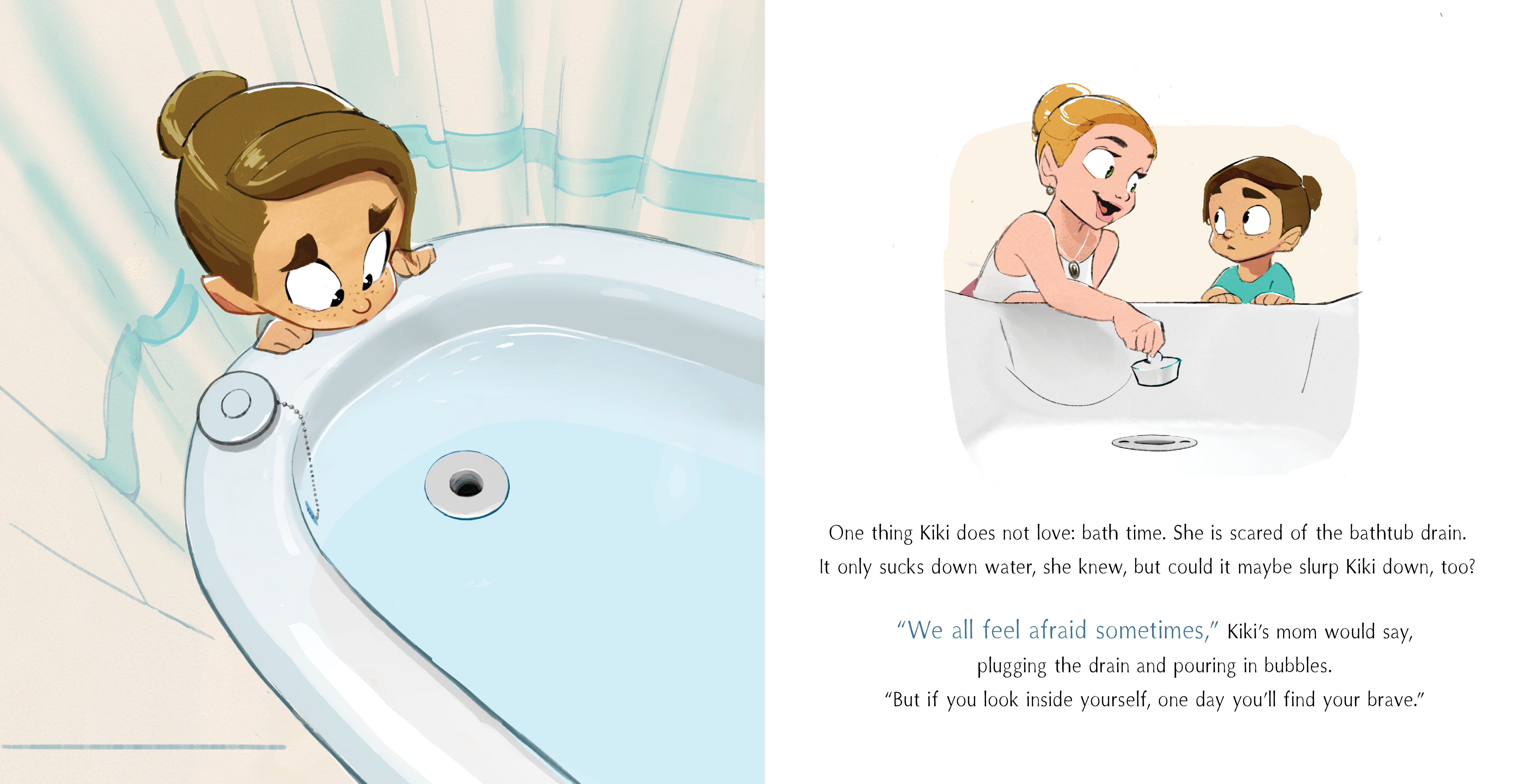 Kiki absolutely dreads bath time because she is scared that the tub drain might want to suck her down into it! During one bath, her curious animal friend Umi splashes under the bath water, and Kiki is swept into a scary-yet-silly undersea adventure, which sees her exploring the depths of her fears and diving bravely into the literal mouth of danger in order to save her best friend.